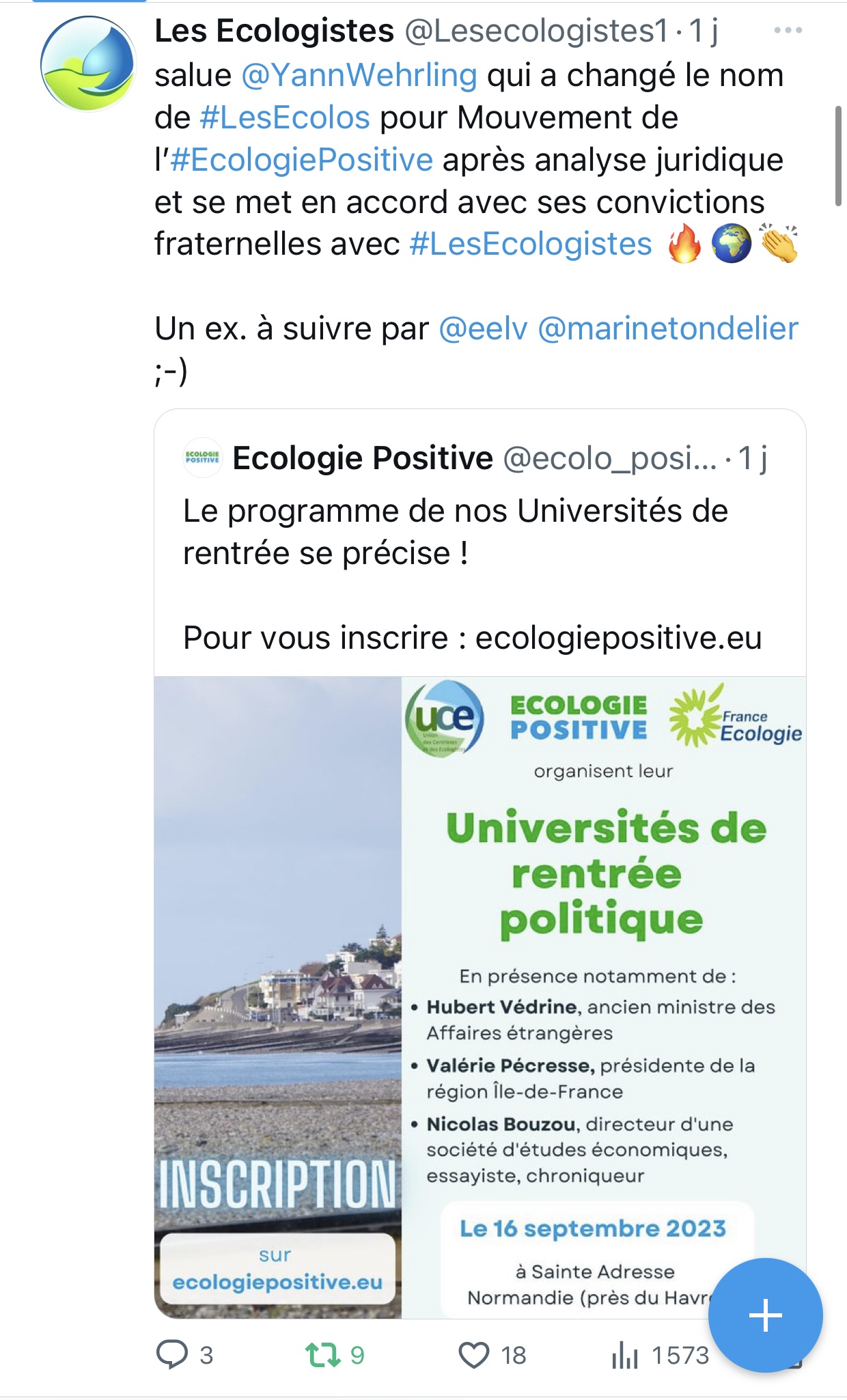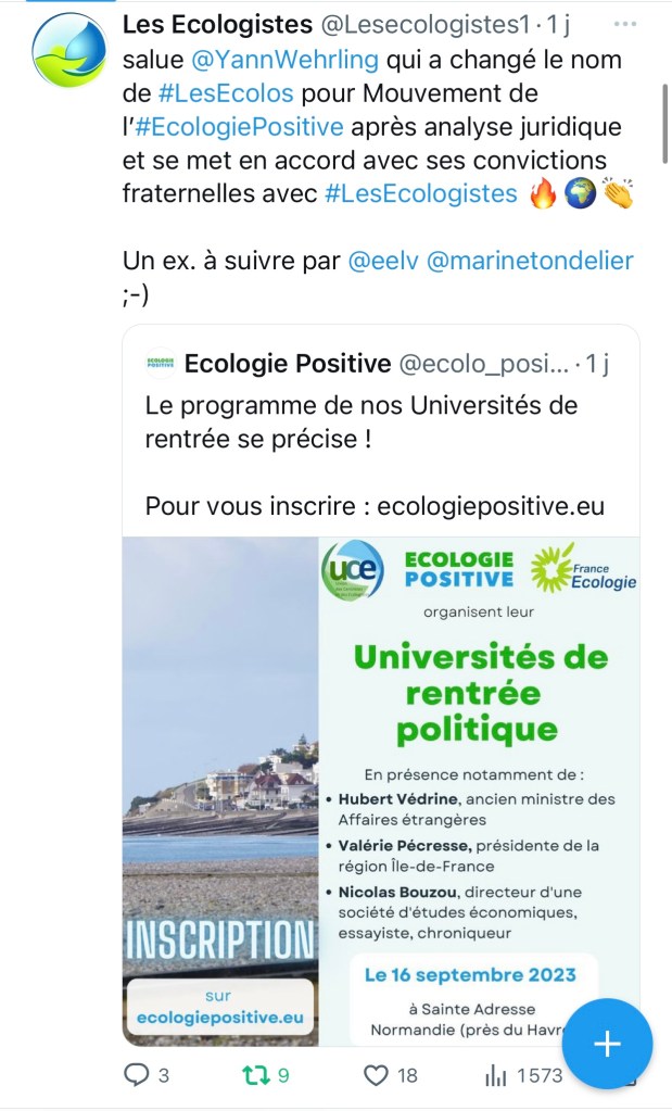 Le compte twitter @LesEcologistes1 salue le changement de nom de Les Ecolos en Mouvement pour l’Ecologie Positive ! le 23 juillet 2023