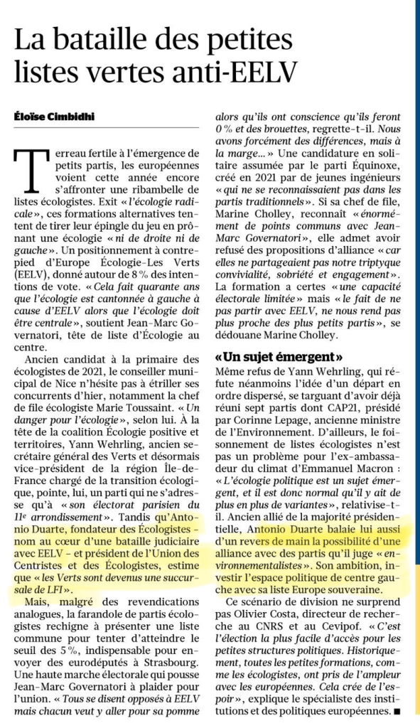 Catégories Actualités Le Figaro / La bataille des petites listes vertes anti-EELV Post author Par iaction Post date 27/03/2024 Aucun commentaire sur Le Figaro / La bataille des petites listes vertes anti-EELV Le Figaro par Eloîse Cimbidhi 20 mars 2024 Partager : Cliquer pour partager sur X(ouvre dans une nouvelle fenêtre) X Cliquez pour partager sur Facebook(ouvre dans une nouvelle fenêtre) Facebook J’aime chargement… Articles similaires ← Le Parisien / Les Ecologistes souhaitent proposer à Manuel Valls la tête de liste pour les Européennes 2024 → Le boycott du débat sur Cnews par Toussaint et Gluksmann est une imposture morale et fera monter l’extrême droite ! Laisser un commentaire Annuler la réponse. Δ