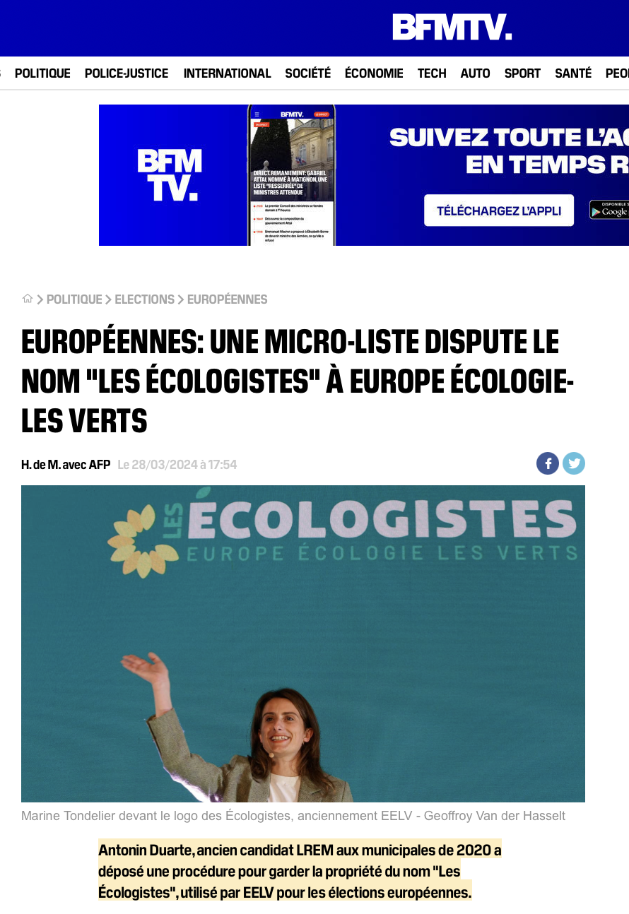Antonin Duarte, ancien candidat LREM aux municipales de 2020 a déposé une procédure pour garder la propriété du nom « Les Écologistes », utilisé par EELV pour les élections européennes.