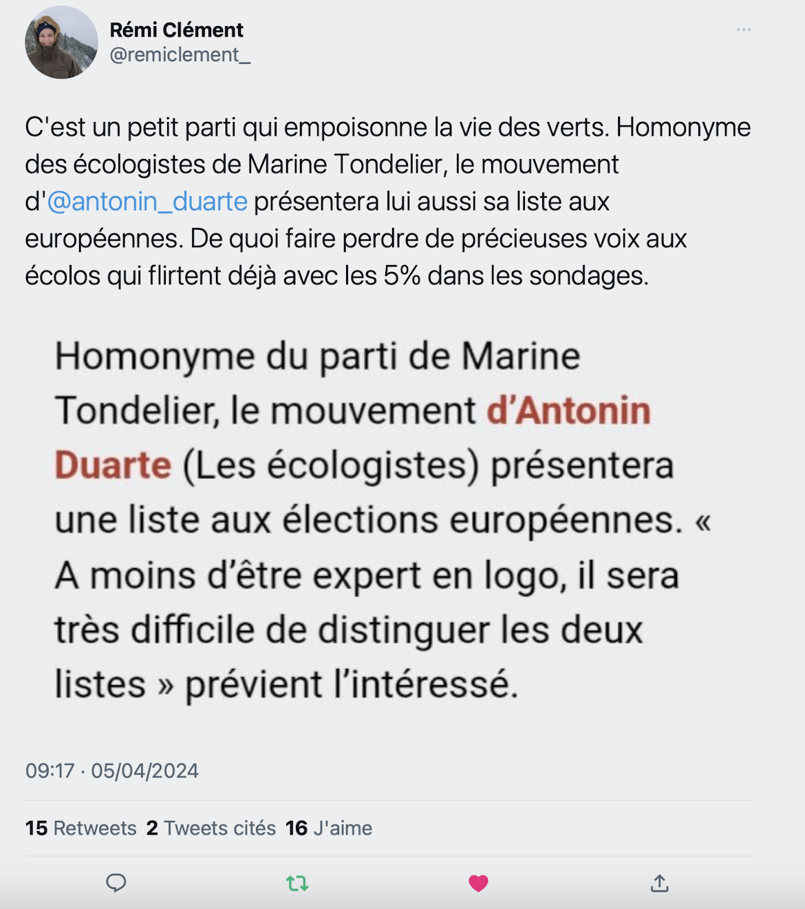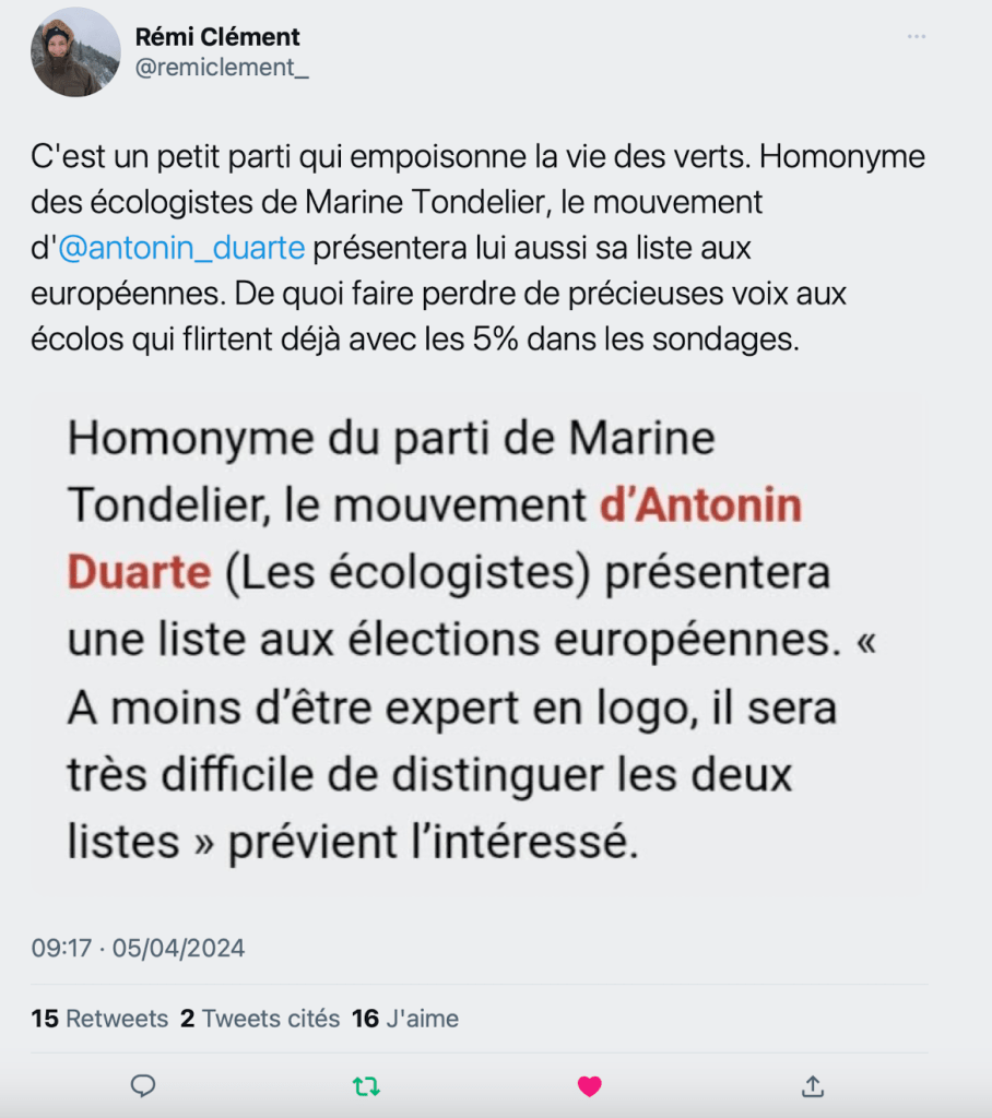 Tweet du journaliste de @Challentes sur X du 05/04/2024 avec l’extrait de la newsletter du magazine Challenges du jour, qui souligne le risque pour la Liste « Les Ecologistes » (EELV) de Marie Toussaint de passer sous la barre des 5%, seuil de qualification pour avoir des élus aux élections européennes, avec la Liste « Les Ecologistes » de Antonin DUARTE.